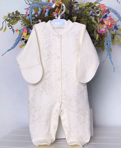 Трикотажный комбинезончик украшенный нежной вышитой сеточкой — красивый наряд для выписки малыша из роддома. Комбинезон швами наружу прекрасно подойдет для новорожденного. Важная деталь — рукавички, их можно использовать как антицарапки.