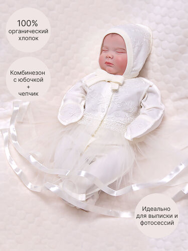 Комплект нарядного трикотажа для новорожденной девочки включает комбинезон с пышной юбочкой и нарядный чепчик. Комплект подойдет для выписки из роддома, встречи первых гостей или крестины.